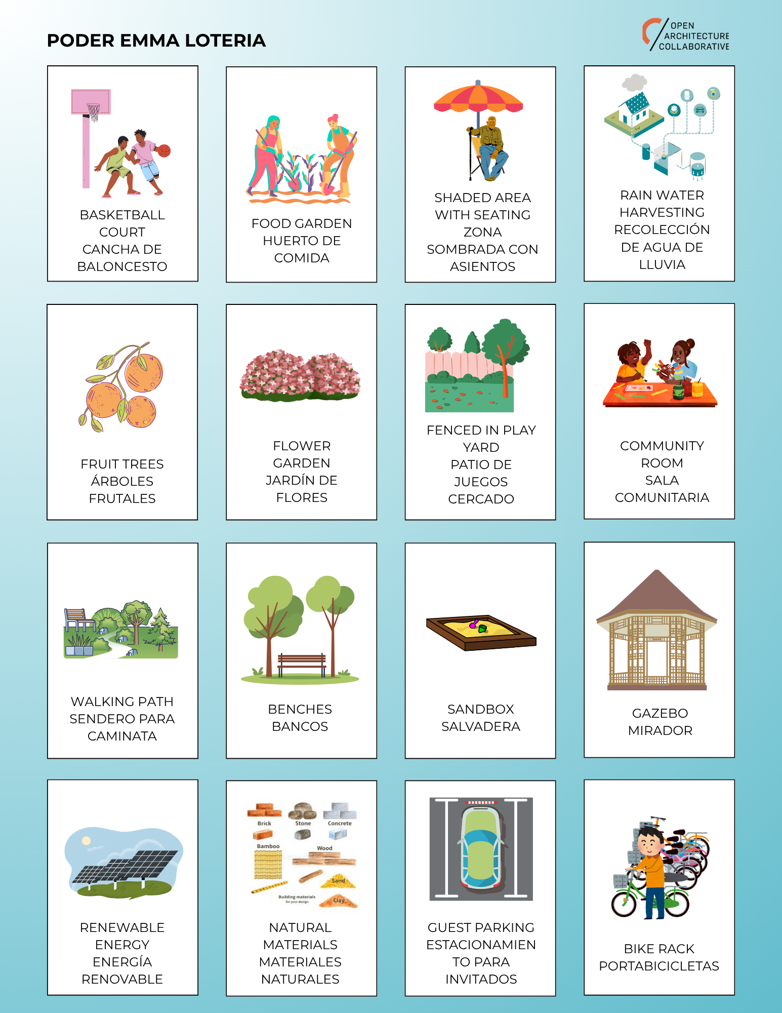 Lotería “game cards” were used to create individual collages as well as design elements to collage onto large site plans.