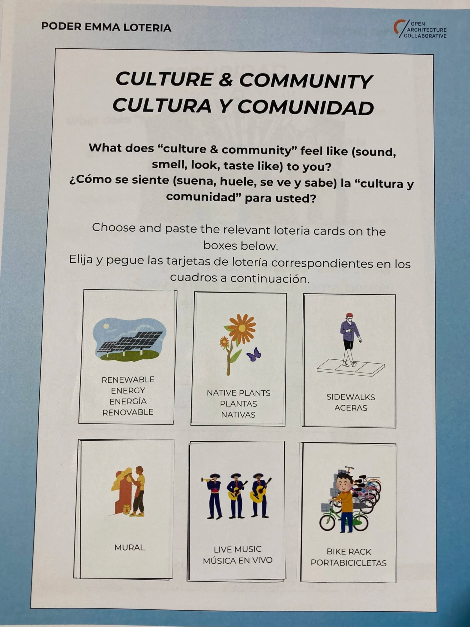 We created a series of prompt sheets that asked questions related to core themes that emerged from the virtual survey. Lotería “game cards” were used to respond to the prompts.